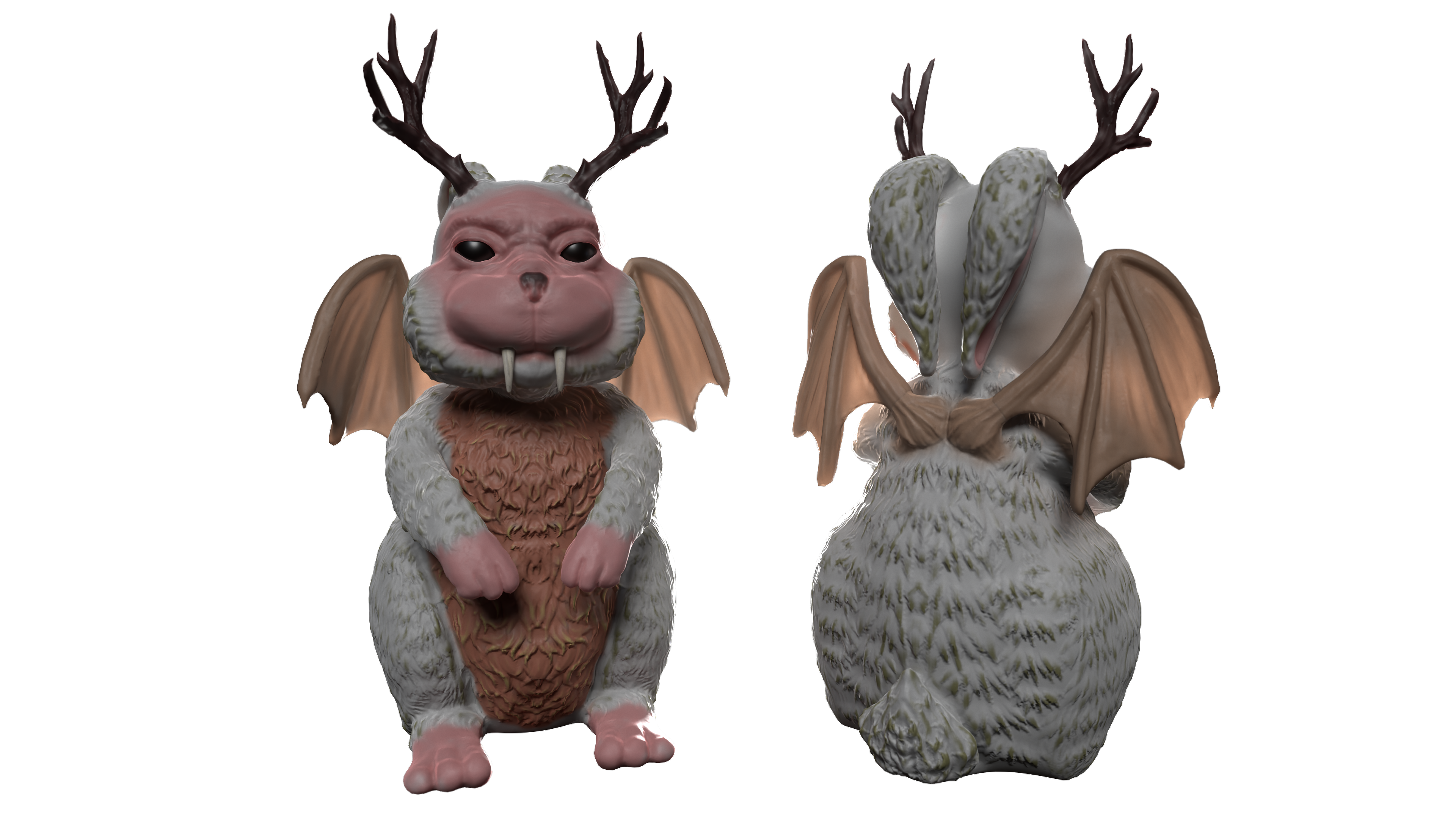 CGI representation of a fictional toyline with fantastic animals in mind. In this issue we have the "lepus cornutus", a being known around the world for several names (Jackalope,Wolpertinger, Etc.). Even though the legend comes from different anecdotes, the final myth is always about a horned rabbit (hare) with fangs and, sometimes, wings. A kind of a mini quimera. it's been fun both to learn about it and to give it a personal vision of this little one.