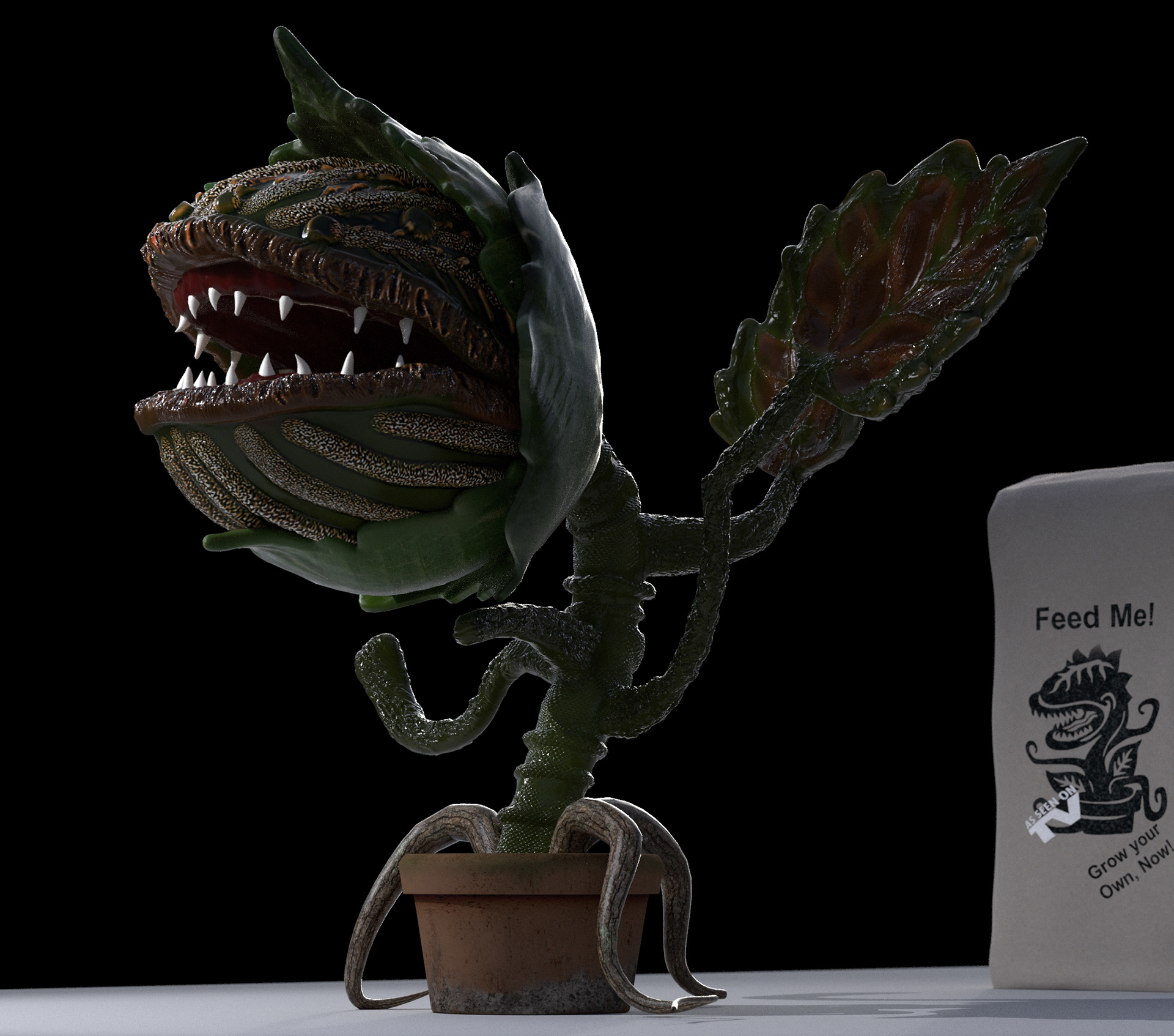 A cosy little plant. I won’t dare to call it #audrey2 So this is my version of one flesh eating plant. The logo of the sack belongs to a guy you can find on Etsy called “the rocking jay” One of my first attempts with #vraynext and #vraycloud #beta